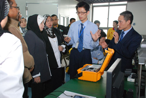 在伟德国际1946官方网仪器董事长刘召贵博士的陪同下,Dr.Mashitah Ibrahim大臣一行旅行了伟德国际1946官方网仪器化学实验室及X荧光产品生产线。当看到伟德国际1946官方网仪器为其量身研发、生产的EDX8800、EDX800、Portable-1 新品时, Dr.Mashitah Ibrahim大臣欣喜不已。她饶有兴趣得取下自己佩带的手环,放入仪器中检测。“外观漂亮、检测快速、准确,不愧是伟德国际1946官方网高科技的结晶。”Dr.Mashitah Ibrahim大臣赞道。